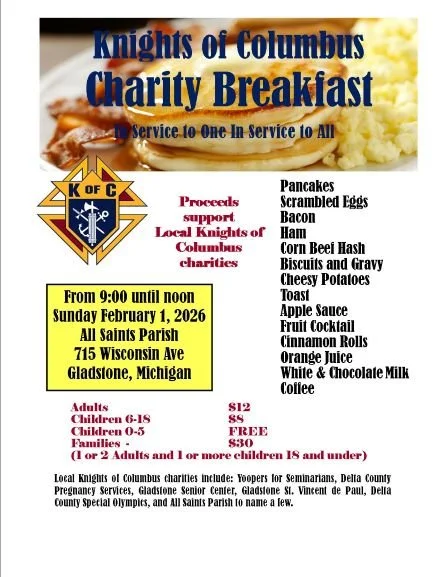 JOIN US ON THE FIRST SUNDAY OF EVERY MONTH FOR A GREAT BREAKFAST PUT ON BY THE KNIGHTS OF COLUMBUS. PROCEEDS GO TO LOCAL CHARITIES.
